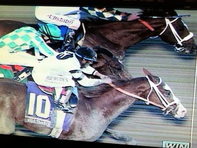 As the determined trio hit the wire, Mucho Macho Man had won it by a diminishing nose, with Will Take Charge a fast closing second on the far outside, and the European invader, Declaration of War in between the two, and just a neck short of the win.